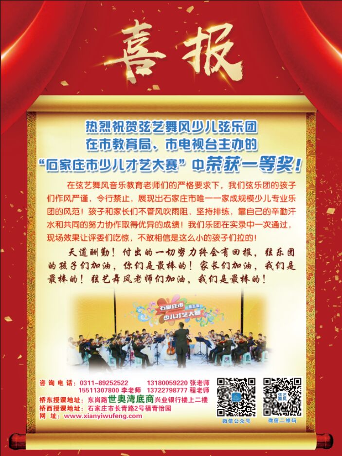 在弦艺舞风音乐教育老师们的严格要求下,我们弦乐团的孩子们作风严谨,令行禁止,展现出石家庄市唯一一家成规模少儿专业乐团的风范!孩子和家长们不管风吹雨阻,坚持排练,靠自己的辛勤汗水和共同的努力协作取得优异的成绩!我们乐团在实录中一次通过,现场效果让评委们吃惊,不敢相信是这么小的孩子们拉的!