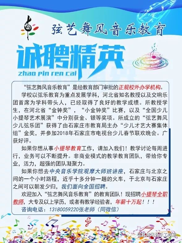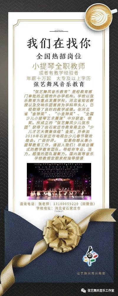 学音乐,从名师!由省内最顶端的教授和省交响乐团首席执棒的少儿弦乐团是省内首家成规模的少儿弦乐团,横空出世后,多次参加各种重大演出!几年间,儿童音乐素养课更是为省内音乐素质教育的提高做出巨大贡献!提琴、舞蹈、钢琴,吉他等课程,靠完整的教学体系和强大的师资队伍,获得《河北日报》等主流媒体、社会和家长们的赞誉!