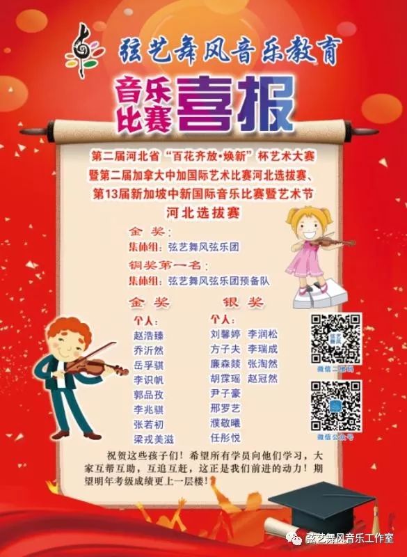 弦艺舞风少儿弦乐团作为省会石家庄首家少儿弦乐团,“横空出世”后参加了石家庄电视台少儿春节联欢晚会,知名栏目《宝贝好榜样》,以及万达广场“快闪”等系列活动,先后取得石家庄市教育局和石家庄市电视台举办的“石家庄市少儿才艺大赛”一等奖,河北省第二届“焕新杯”音乐比赛金奖 等奖项,乐团队员更是在“金钟奖”“小金钟奖”等比赛中频频获奖。