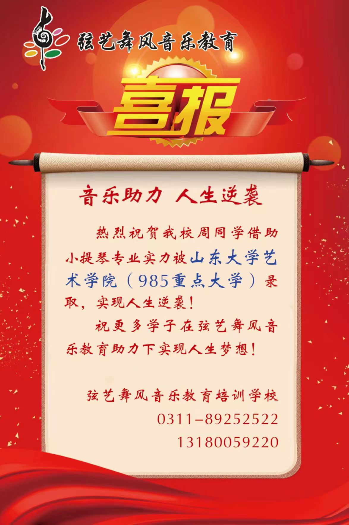 热烈祝贺我校周同学借助提琴专业实力被山东大学音乐学院(985院校)录取,实现人生逆袭!